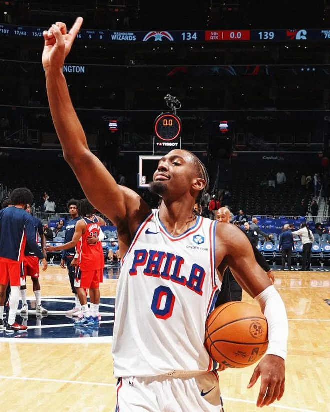 NBA官方社交媒体晒出泰雷斯-马克西高举手指比出“第一”手势的庆祝画面,配文简短而有力:“76人现在是东部第一。”这张照片背后,是费城76人开季4胜0负的完美战绩,更是一个25岁后卫的超级进化史。